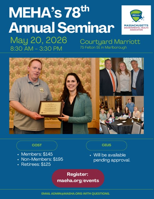 The Massachusetts Environmental Health Association (MEHA) has been a cornerstone in the field of Public and Environmental Health since its establishment in 1948. As an affiliate of the National Environmental Health Association (NEHA), MEHA is committed to advancing the professional development of its members through high-quality training and educational programs.