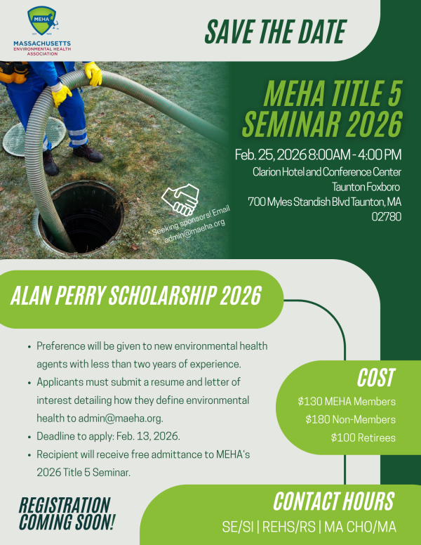 Save the Date Registration for MEHA’s annual Title 5 Seminar opens on December 1st! This annual event brings more than 200 septic industry experts and public health professionals together for